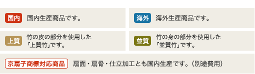 弊社の扇子の骨に使用される竹の品質は、竹の皮の部分を使用した「上質竹」と竹の身の部分を使用した「並質竹」に分かれます。上質竹は硬くコシやツヤがありますが、希少部位の為高級品となります。並質竹は柔らかくツヤがありませんが、1本の竹から採取できる量が多い為、部材費用が安くコストを抑える事が出来ます。それぞれ対応している商品が異なりますので、詳しくは各商品の詳細をご確認下さい。