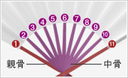| 中骨(なかぼね) | 親骨に挟まれた骨をいいます。 薄くてしなやかな部分になります。 |